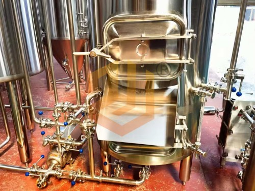 過濾槽與旋沉罐:采用上下(xià)兩層的設計方式,整(zhěng)體占地麵積小(xiǎo),過濾槽采用銑製篩板,頂部采用(yòng)異型人孔設計,側麵配有(yǒu)出糟口,方形人孔門設(shè)計更有利於啤酒麥糟的清理工作,同時還配有出糟板。內部配有耕刀裝置,用於疏鬆麥糟層以(yǐ)及出糟使用。