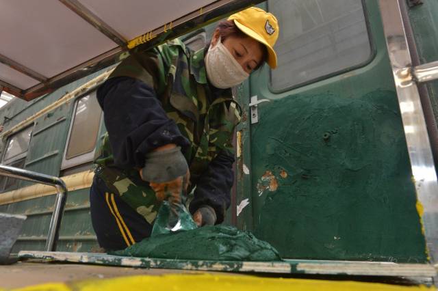 第二道工序是刮膩(nì)子。為了便(biàn)於修複,車皮上每一破損處的石膏、膩(nì)子至少需要刮兩遍,再用砂紙打磨,最後還要刷上一層油膩子。完成這道工序時(shí),女工們要站在車下或踩在兩米高的高凳車上,重複著一個單調的動作:左手拿砂紙用力打磨車皮,右手拿鏟子刮膩子。